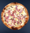 Crème fraîche légère, Munster AOP d'Alsace, Mozzarella fleur de lait DOP, lardons fumés au hêtre, oignons rouges frais, champignons frais
